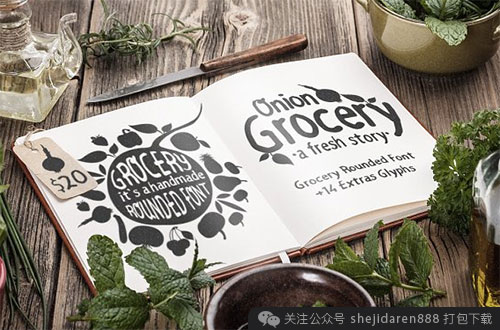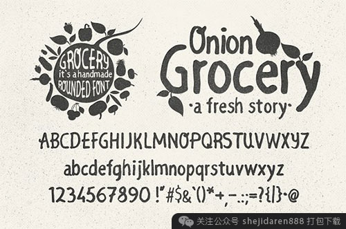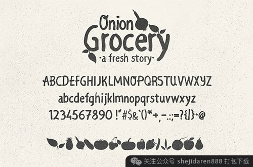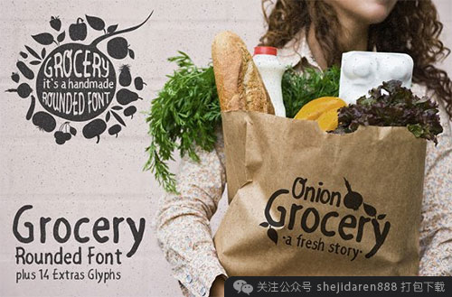 很好看杂货店圆角手工字体,线条圆润有趣,除字体元素外,还包括14个蔬菜/水果图案,话说该字体设计师做的字体 Banner 也超好看哦!