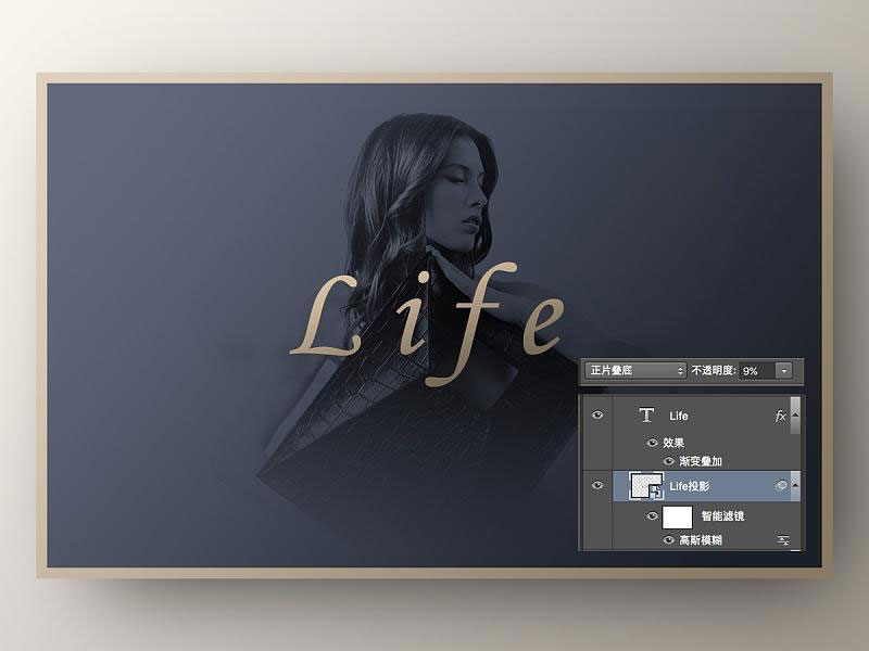 输入主体文字,图层模式渐变叠加,根据光源调整颜色渐变。复制一层作为投影,改为黑色正片叠底,转智能对象后模糊对象,调整透明度和大小,放在字体后面。(投影模拟真实感,需要若有若无的感觉,让文字有悬浮在图层上面,丰富画面层次感)。