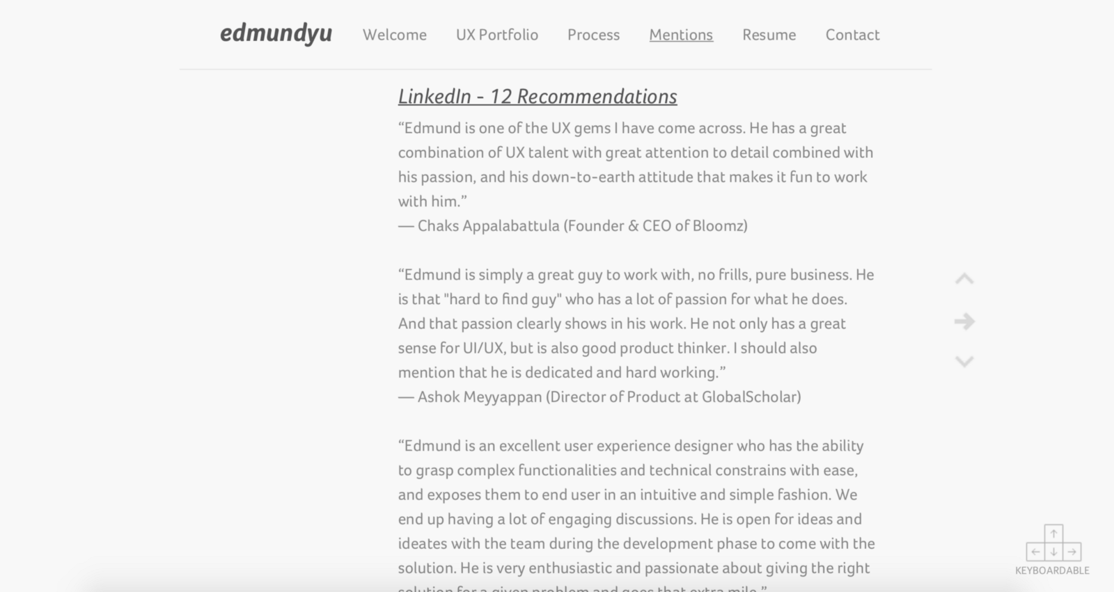 借他人之嘴来反映你的优势其实很符合现如今这个互联网时代。在作品集当中,将用户对你的反馈、嘉奖,甚至推荐呈现出来,是对你的设计能力的肯定,也是你能力的明证。