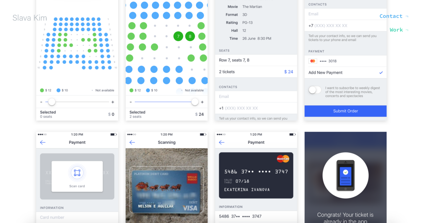 Slava Kim 的这个作品集就是反例,过多的关注视觉展示,而忽略了UX的流程和基本的信息。