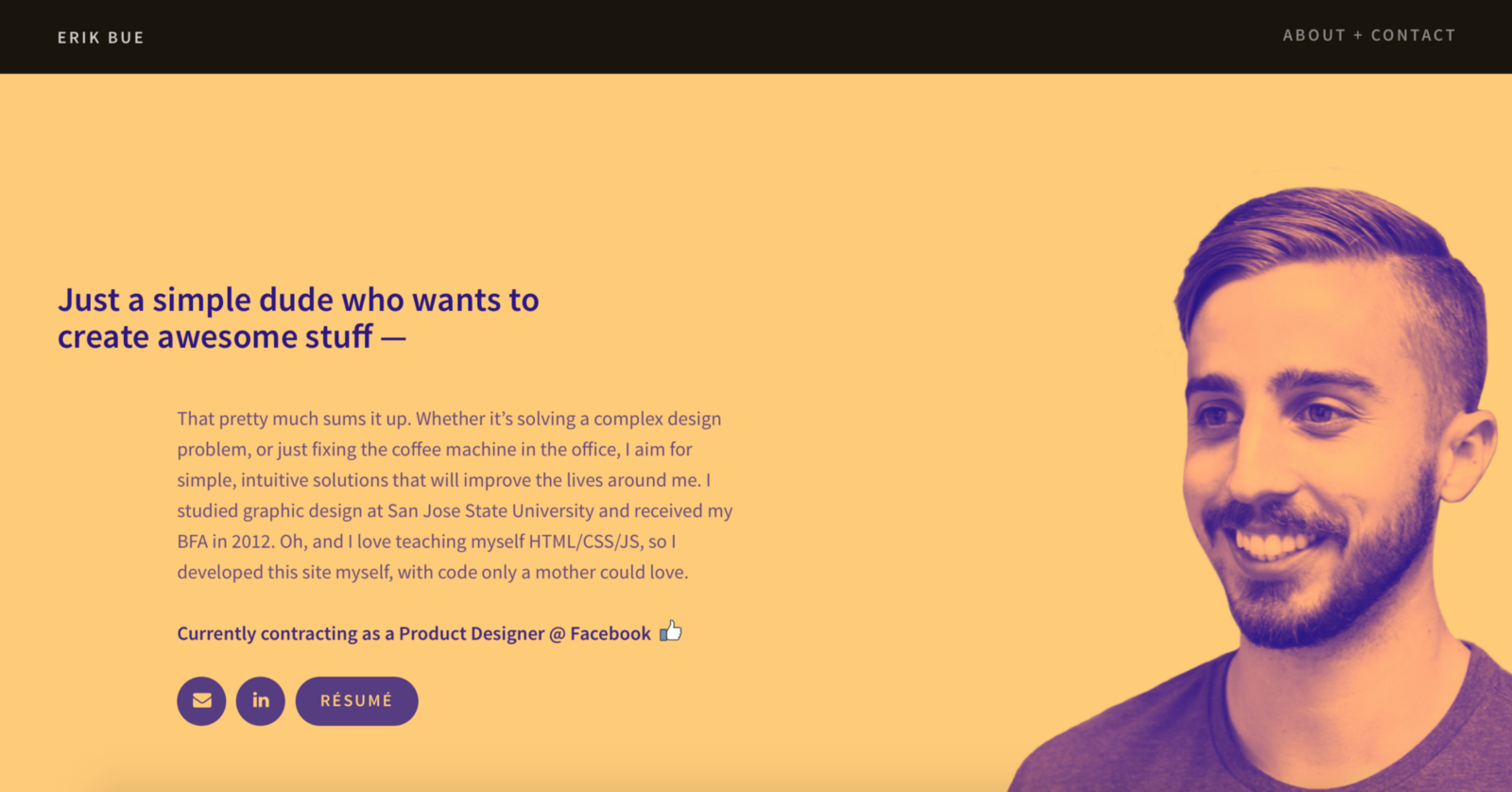 Eric Bue 的关于我页面就做的干净整洁,又足够有个性。