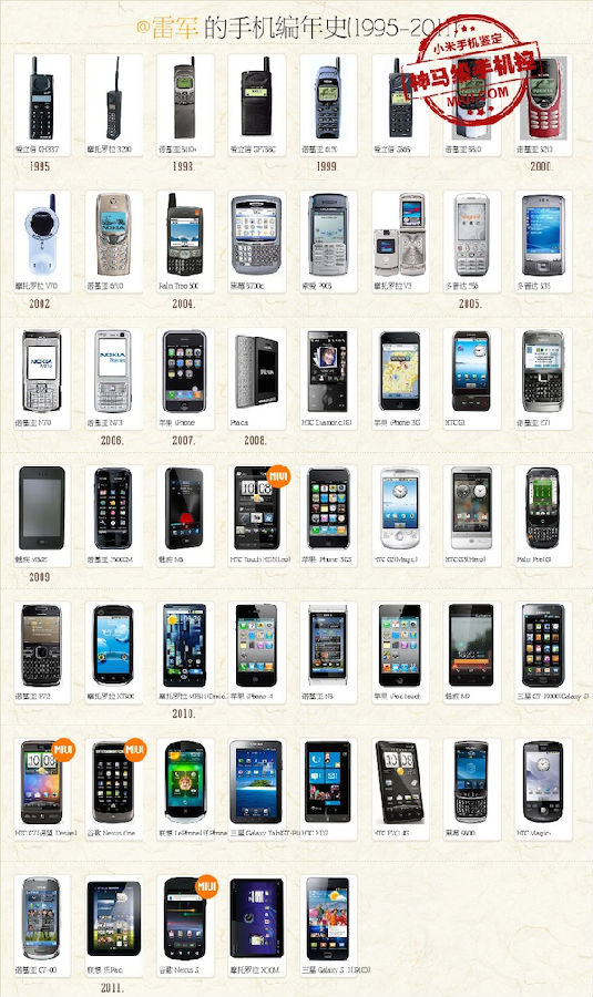 小米曾经做过一个“我的手机编年史”的网页端应用,你可以在里面找到自己用过的所有手机,然后生成一张图片,然后你可以直接分享到社交网络。这个应用我当时也玩过,确实很有意思。