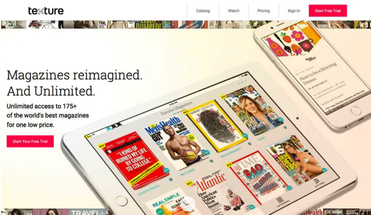 其他的大牌网站也同样重拾了这种渐变设计用于用户交互。Texture——一家在线杂志供应商——回归得比较彻底,整屏都是渐变。